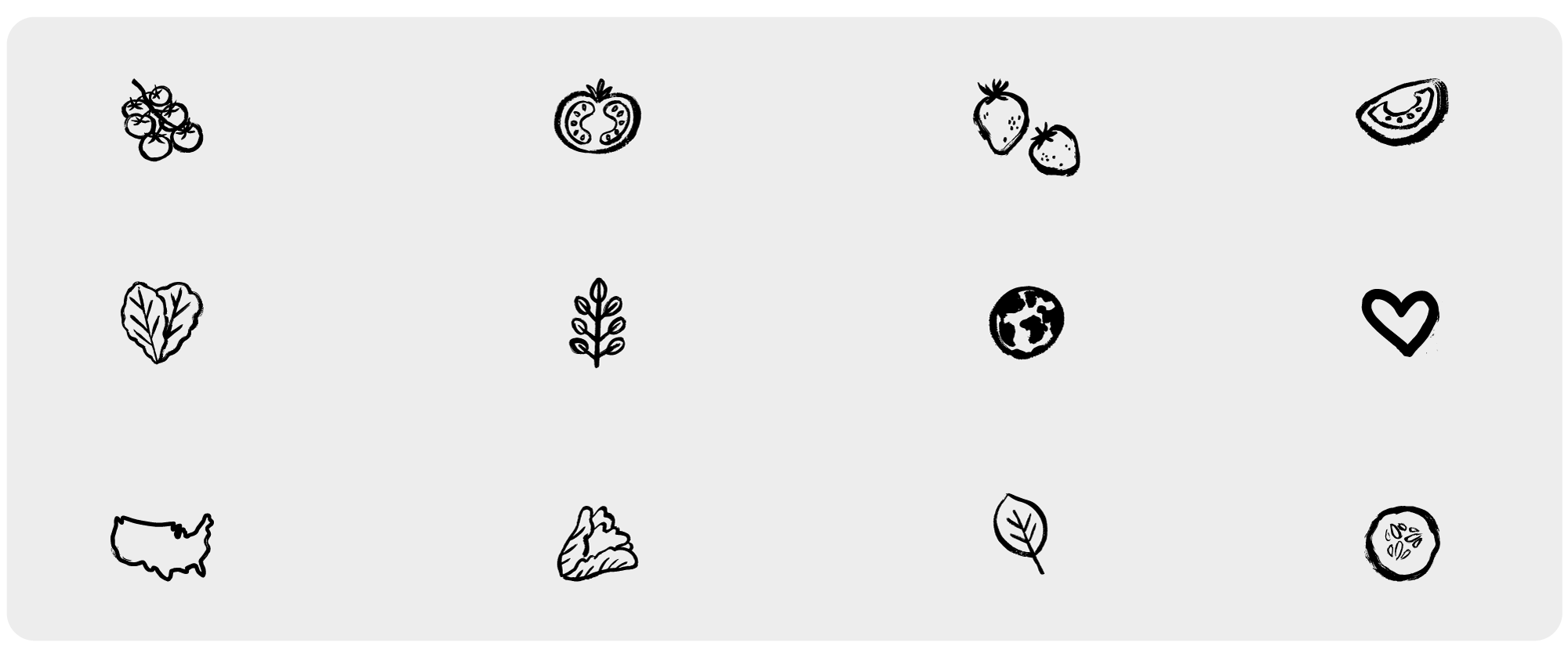 AppHarvest’s icons bring warmth, movement, and a dynamic element to the brand. The loose, hand-drawn style not only sets them apart from others, but further emphasizes the human hand behind everything they do. It helps create an environment which makes space for bold statements in playful lettering. Additionally, the icons add a textural element. They’re a little gritty/dirty...showing in true American spirit, “we’re not afraid to get our hands dirty as we work toward a better future”.