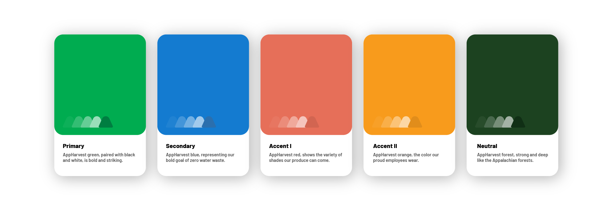 Color has an enduring emotional appeal. AppHarvest green, paired with black and white, is bold and striking. When used strategically with other accent colors you can really harness AppHarvest’s roots and personality. When used correctly all colors also have a primary function with in the design system that supports the purpose of the content, communicates hierarchy or interactive states.